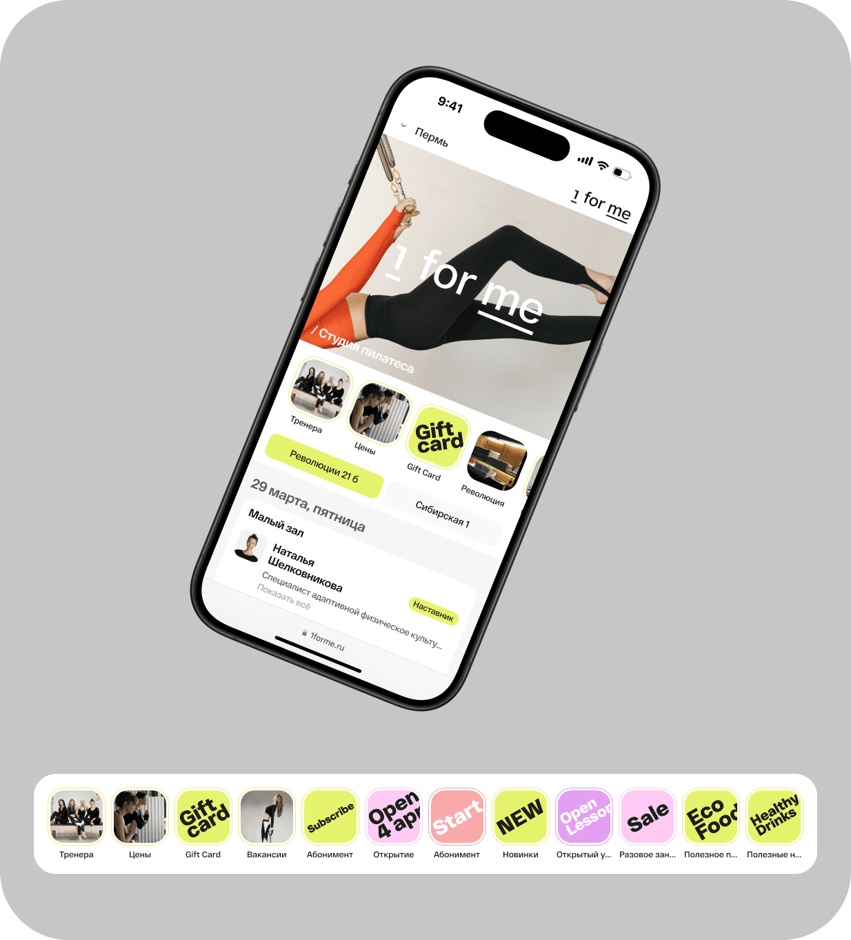 Specific (Конкретная) : Внедрить приложение 1ForMe для поиска секций пилатеса, просмотра тренеров, покупки абонементов, подарочных карт и персональной аналитики.