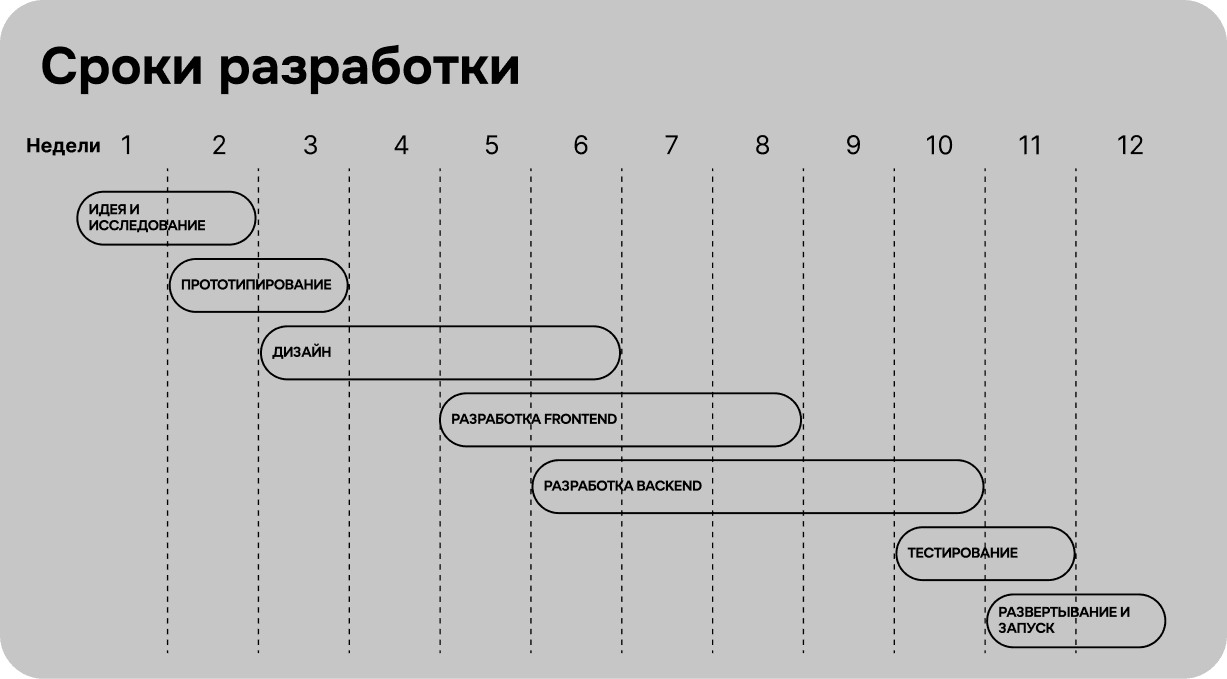 Для того чтобы и мы и закачик примерно понимали за какое количесво времени мы справимся была сделана диаграмма ганта со сроками (сделали ее прямо на созвоне со стейкхолдером).