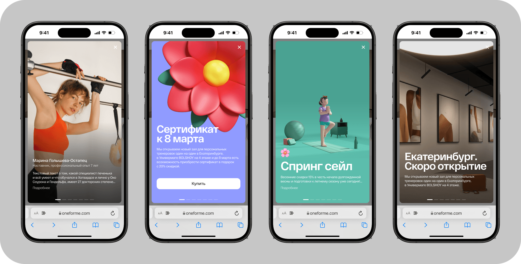 Также было принято решение сразу сделать много видов разных историй: рекламу тренеров, рекламу о поиске тренеров, предложение о покупке абонементов и тд