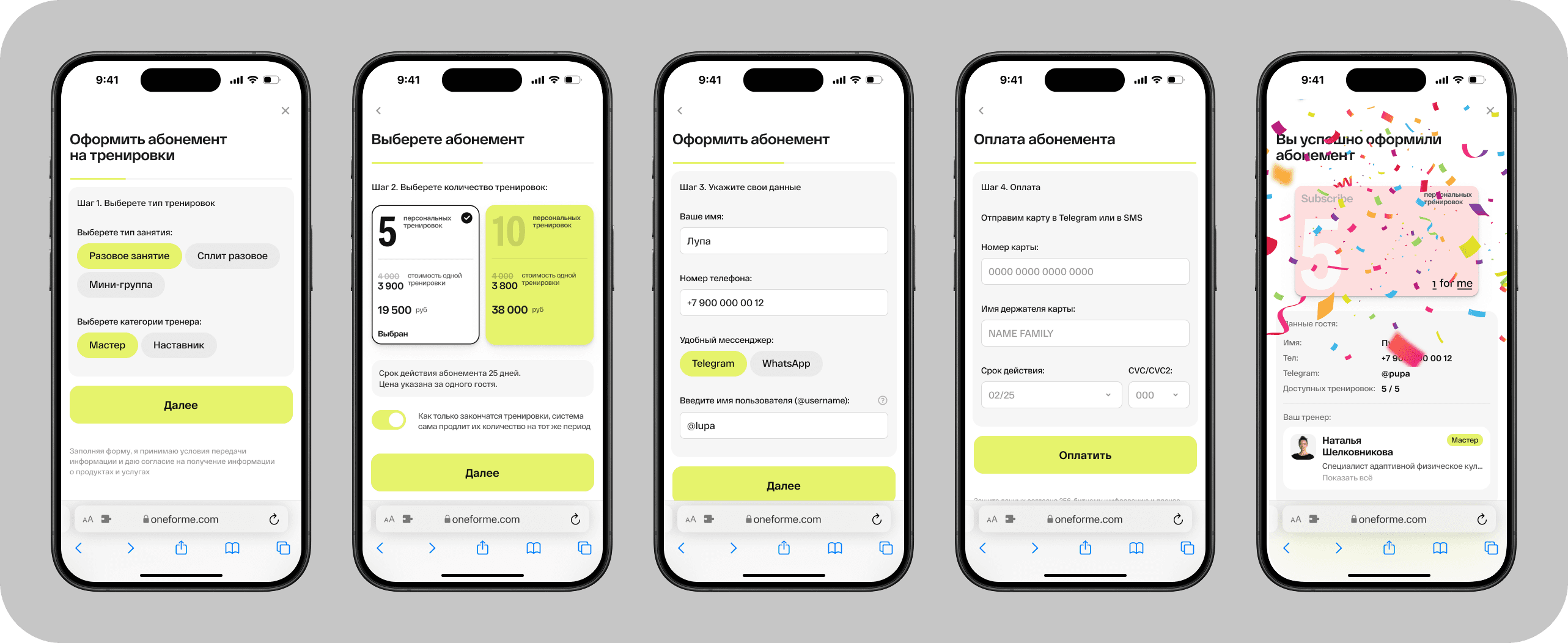Проект стартовал с запроса владельцев студии 1forme, которая только открывалась и не имела приложения для взаимодействия с клиентами. Команда состояла из четырех человек: я как middle designer, Product Manager (бывший дизайнер, который меня менторил и помогал с фидбеком), frontend-разработчик, backend-разработчик и стейкхолдер.